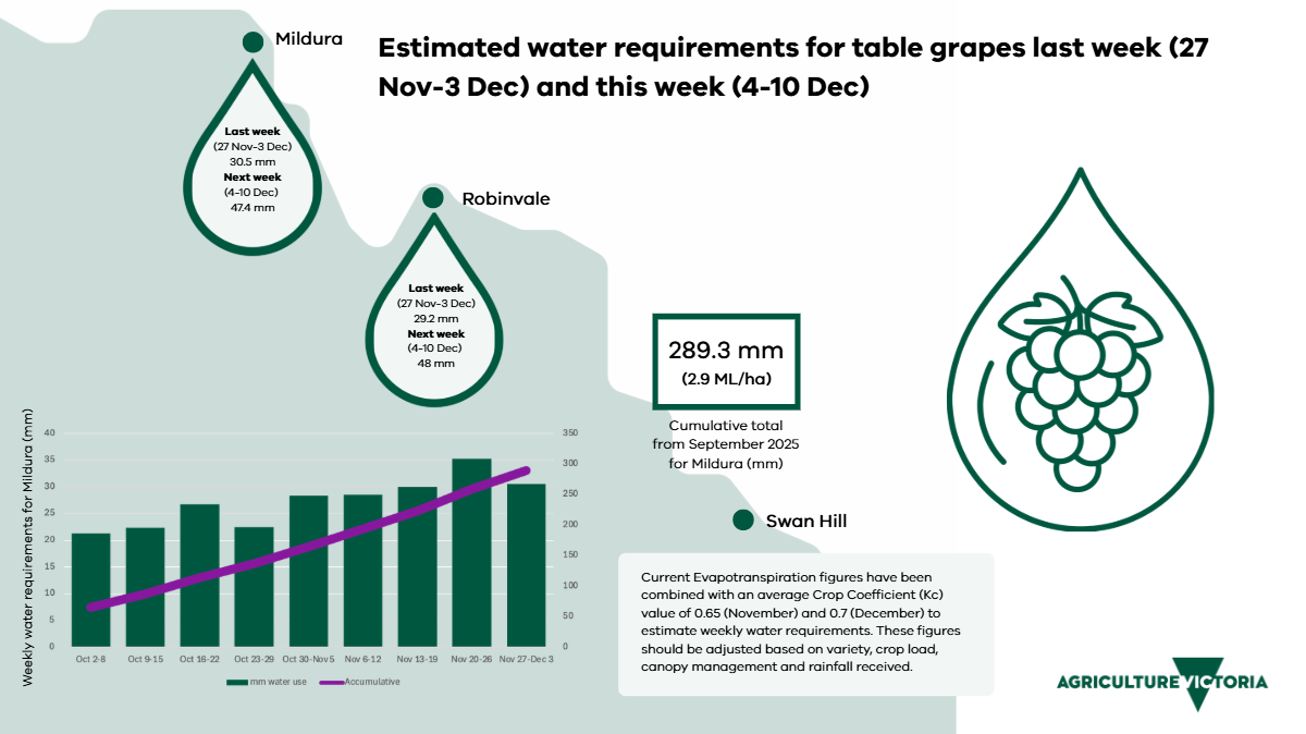 Most horticultural crops do not fully cover the ground, and the ETo figure needs to be adjusted by a crop coefficient (Kc) in order to estimate the crop evapotranspiration (ETc). Crop coefficients are a set of numbers that reflect the crop being grown and the developing canopy. These adjustments have been made in the following graphic to estimate recent and future table grape water requirements at Mildura and Robinvale. This knowledge can assist tablegrape producers with their irrigation management.