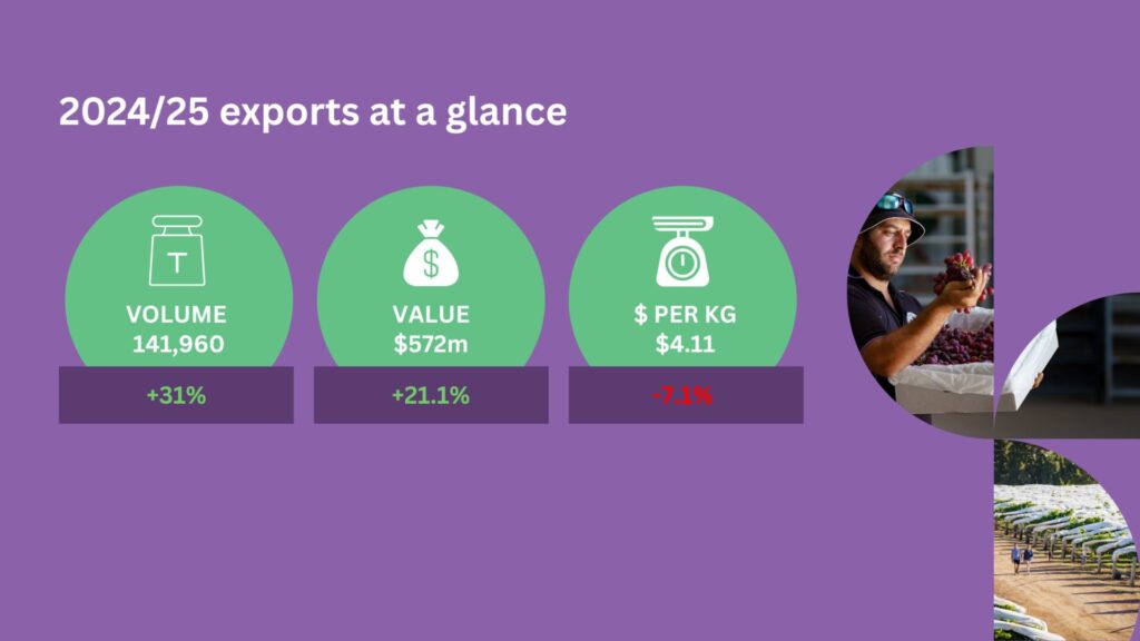 At the industry’s peak in 2019/20, table grape exports were valued at $623 million, from a total national production value of more than $800 million. In 2024/25, the industry achieved its second-highest result, exporting 141,960 tonnes valued at $572 million. This figure was 31% up on the 2023/24 export value of $476.73 million, and just above the 2022/23 result of $556 million. Price per kilogram of exported grapes declined -7.1%, to $4.11.